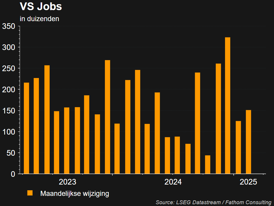 - De Fed schuift met haar voorspellingen wel wat op richting een stagflatiescenario met lagere groei (1,7% in 2025) en hogere werkloosheid (4,4%).