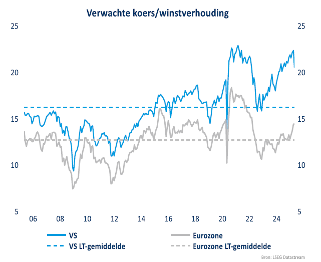 - De aandelenmarkten blijven vrij duur geprijsd. Helemaal bovenaan staat de VS qua verwachte koers-winstverhoudingen, enkel Indië is nog duurder. Europa bevindt zich in de middenmoot.