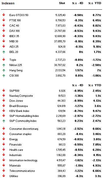 - Wall Street ging initieel weifelend van start, met kwartaalcijfers die kort na de opening de toon zetten. Amazon (-3%) voorspelde voor het huidige kwartaal slechts 5% à 9% omzetgroei, het traagste tempo ooit, zodat consumentenaandelen, naast communicatiediensten, onderaan de sectorladder bengelden, terwijl energiebedrijven wél een goede dag kenden.