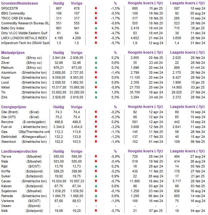 - De PMI-dag vorige week vrijdag bracht één en ander teweeg op de obligatiemarkten, terwijl die eer gisteren voor de Duitse verkiezingen weggelegd was. De trofee die Wall Street vrijdag meenam was er een van ‘grootste verliezer’, want de S&P500 verloor zo’n 1,7%, terwijl de Nasdaq 2,2% lager afklokte. De techindex klokte de week door winstneming bij de Magnificent 7 bedrijven zo af op 2,5% verlies, de slechtste prestatie in drie maanden. Op de grondstoffenmarkten bleef goud stek op 2.942 dollar per ounce, waarmee de nu acht weken durende rally aanhoudt. De olieprijs daalde wel fors, tot 74,2 dollar per Brent-vat, omdat een vredesovereenkomst met Oekraïne de sancties tegen Rusland kan versoepelen in het voordeel van extra olie-export.
