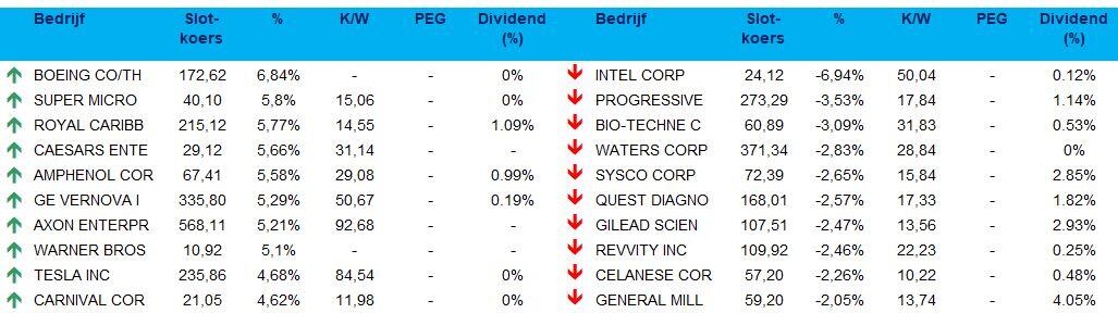 Nike: {{276651, NIKE INC., NKE}} deze avond komt het bedrijf met cijfers. Nike zal naar verwachting een omzetdaling van 11,5% rapporteren in het derde kwartaal, de grootste daling in bijna vijf jaar. Dit komt door de tegenvallende verkoop van nieuwe producten. Foot Locker, een grote Nike-retailer, meldde dat promotionele druk de winstmarges zou schaden. Nike's nieuwe CEO, Elliott Hill, heeft ambitieuze plannen, maar analisten zijn sceptisch over snelle verbeteringen. De winst per aandeel zal naar verwachting dalen tot 29 dollarcent, vergeleken met 77 dollarcent een jaar eerder.