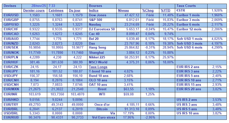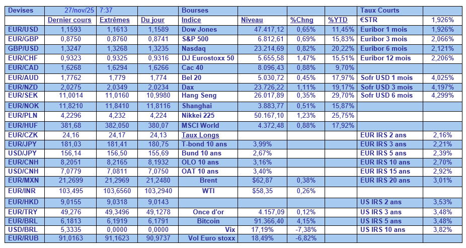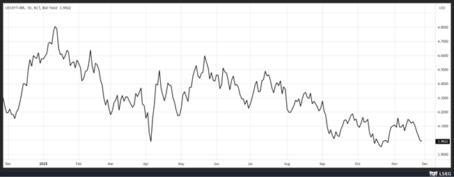 Comme la probabilité d’une baisse des taux en décembre est de plus de 80 %, le rendement du Treasury 10 ans est passé sous la barre des 4 %, ce qui a aussi pesé sur le dollar.