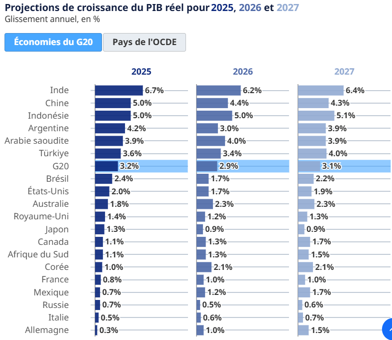 Pour expliquer cette résistance, l’OCDE pointe l’assouplissement des conditions financières, l’orientation expansionniste des politiques macroéconomiques ainsi que la forte demande de nouveaux investissements liés à l’intelligence artificielle dans certains pays, en particulier aux États-Unis.