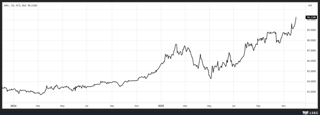 J’évoquais lundi la croissance solide en Inde, ce qui n’a pas empêché la roupie indienne de franchir le seuil psychologique de 90 pour un dollar ce matin.