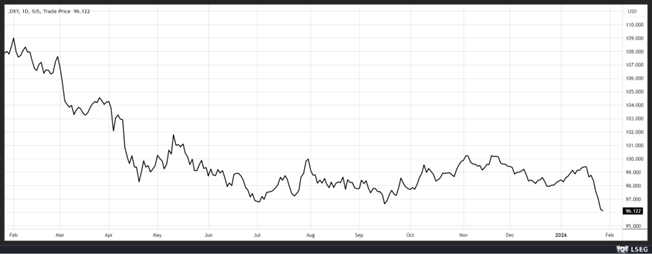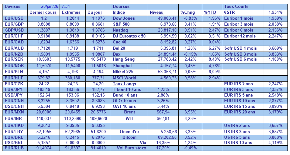 Le dollar a continué de reculer et est passé au-dessus de 1,20 par rapport à l’euro, ce qui a soutenu encore un peu plus l’or, qui se traite au-delà des 5 200 $, ainsi que le prix du baril, également en hausse à cause des craintes d’interventions américaines en Iran.
