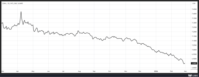 Cette prudence par rapport aux valeurs technologiques se reflète aussi dans une certaine méfiance par rapport au dollar, car même s’il reste stable par rapport à l’euro, en revanche, il continue de s’affaiblir tout doucement par rapport au yuan, comme le montre le graphique.