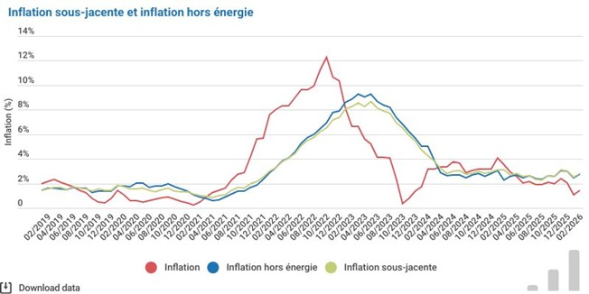 De l’inflation en Belgique, qui est passée de 1,10 % en janvier à 1,45 % en février, comme d’ailleurs pour l’inflation sous-jacente qui est passée de 2,54 % à 2,83 %.