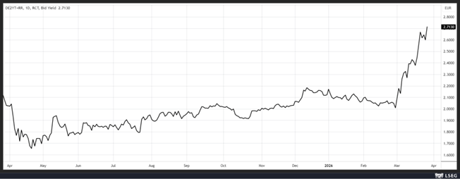 Par exemple, le rendement du Bund 2 ans a encore progressé, affichant une hausse de 70 points de base depuis le 1er mars.