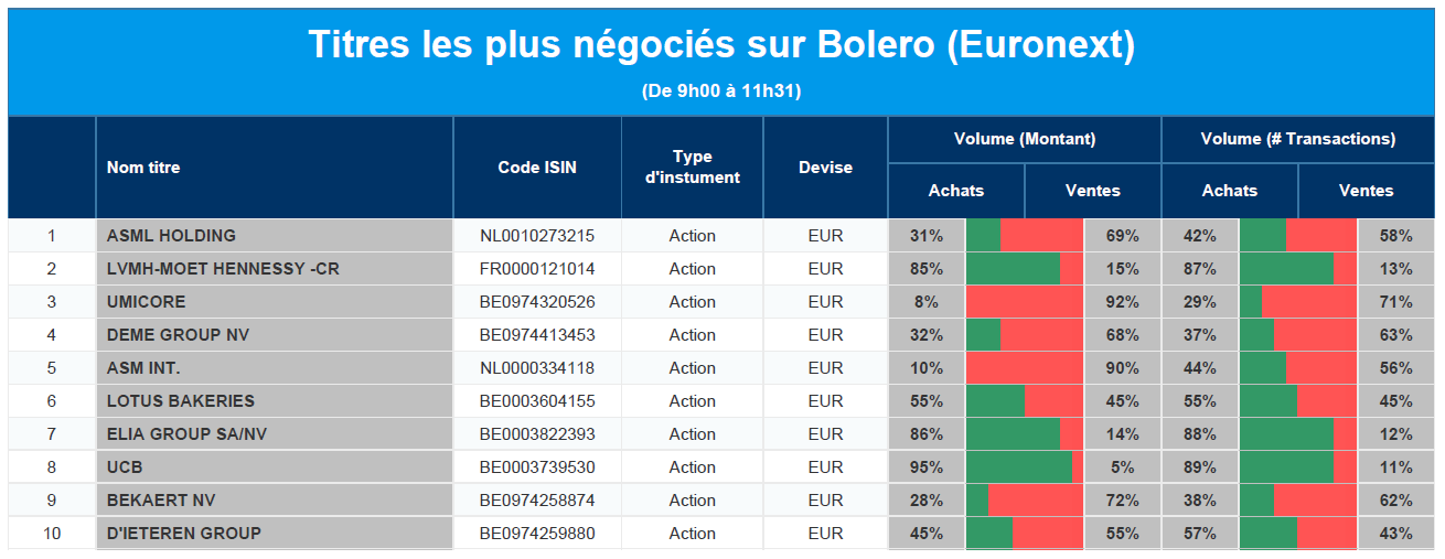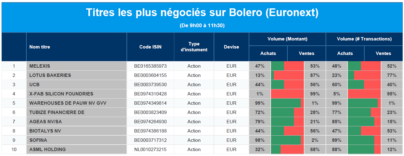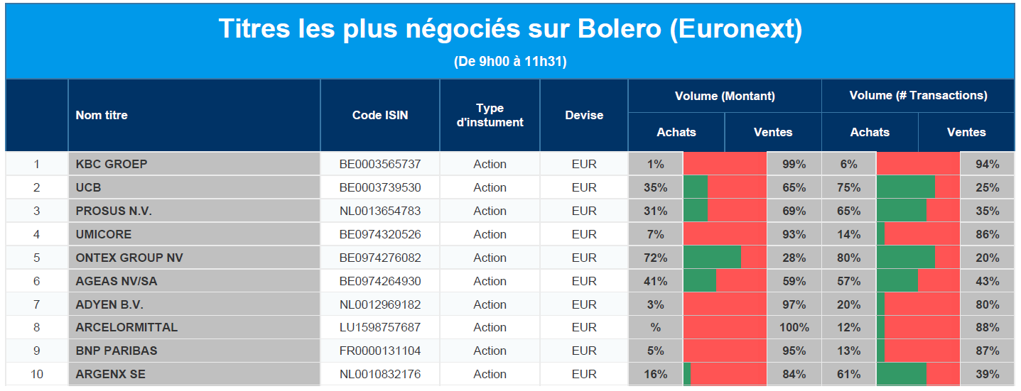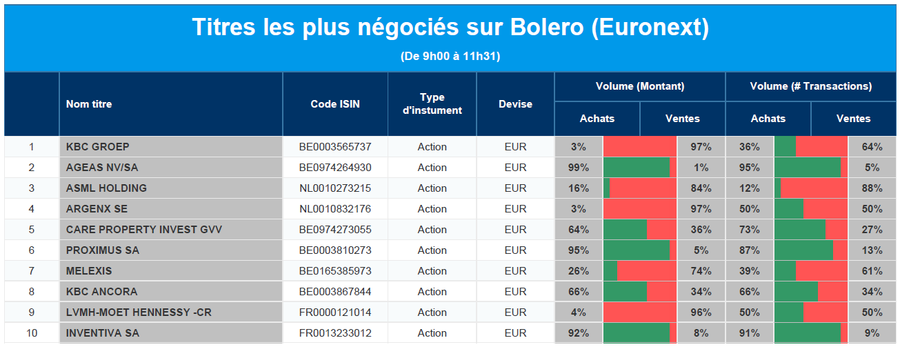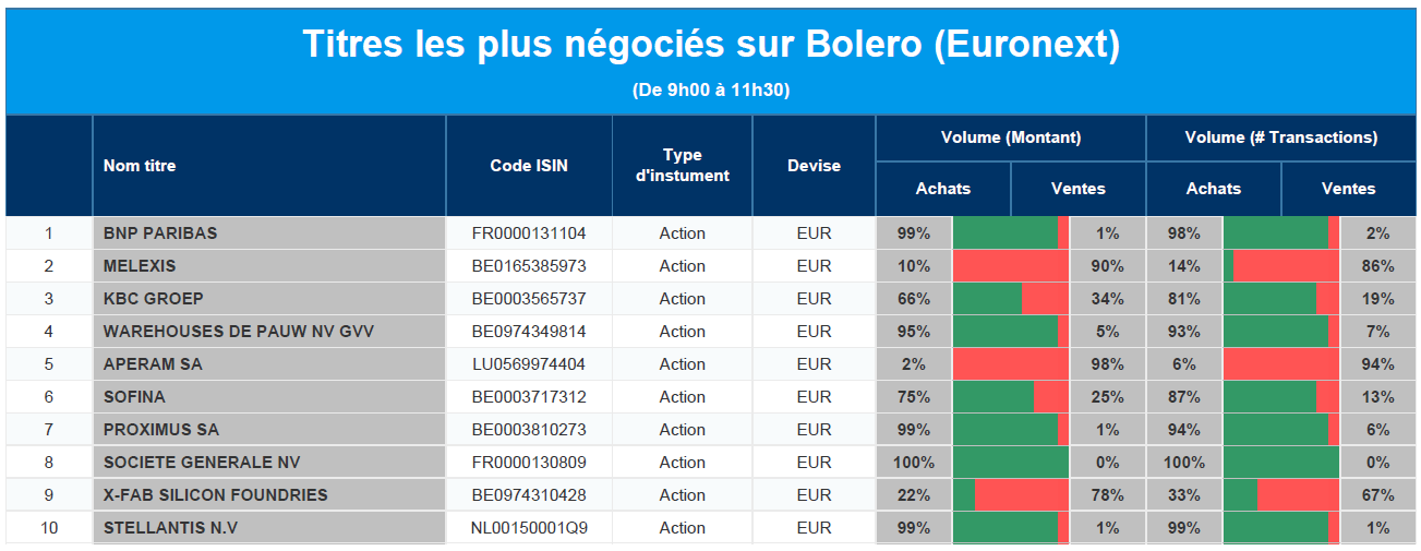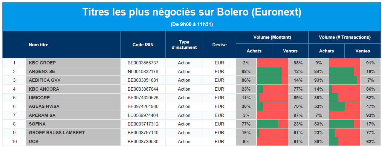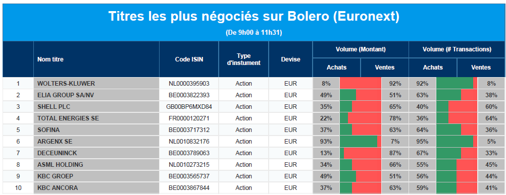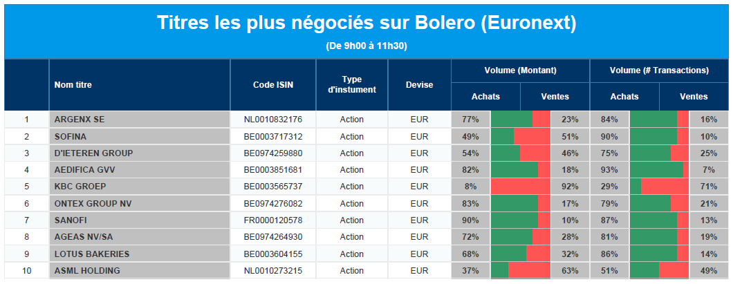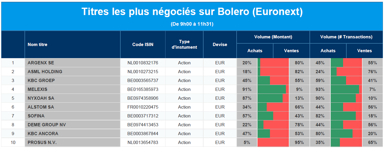 Chaque jour, nous vous offrons un aperçu des titres les plus négociés chez Bolero sur Euronext. Idéal pour prendre la température du marché boursier et pour découvrir les actions ou les titres que les autres investisseurs s'arrachent !