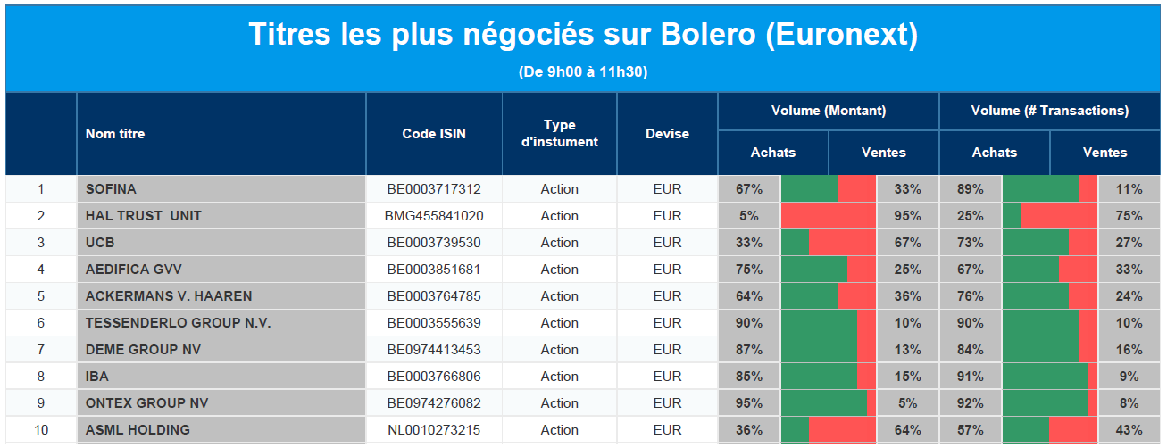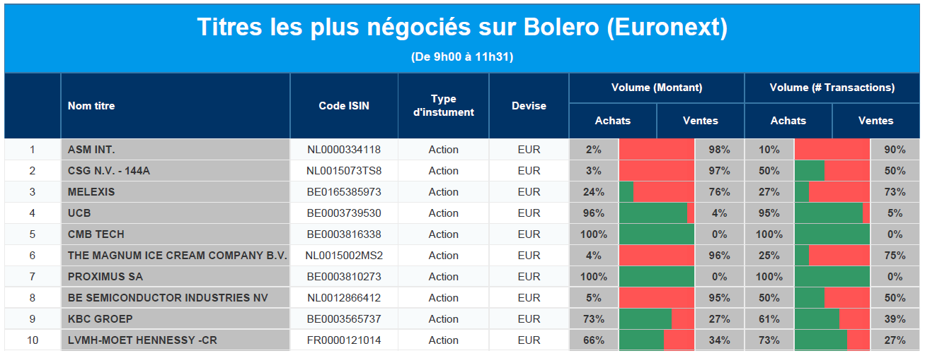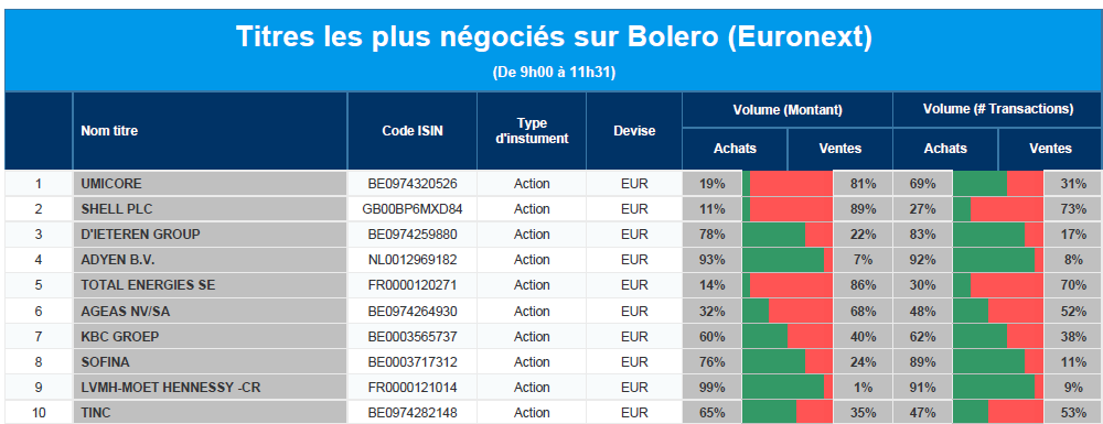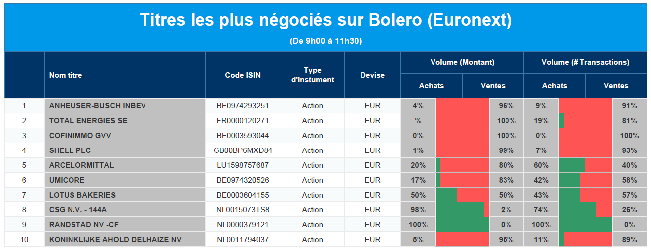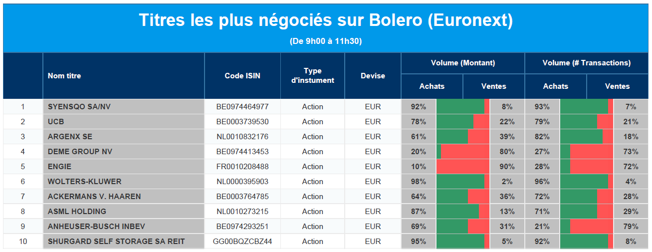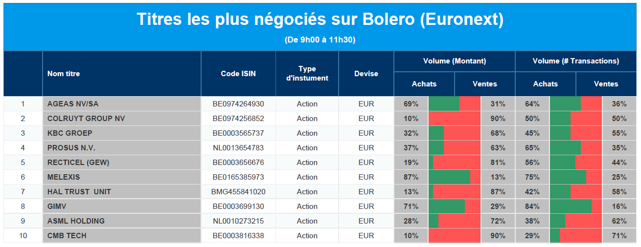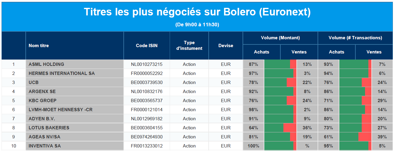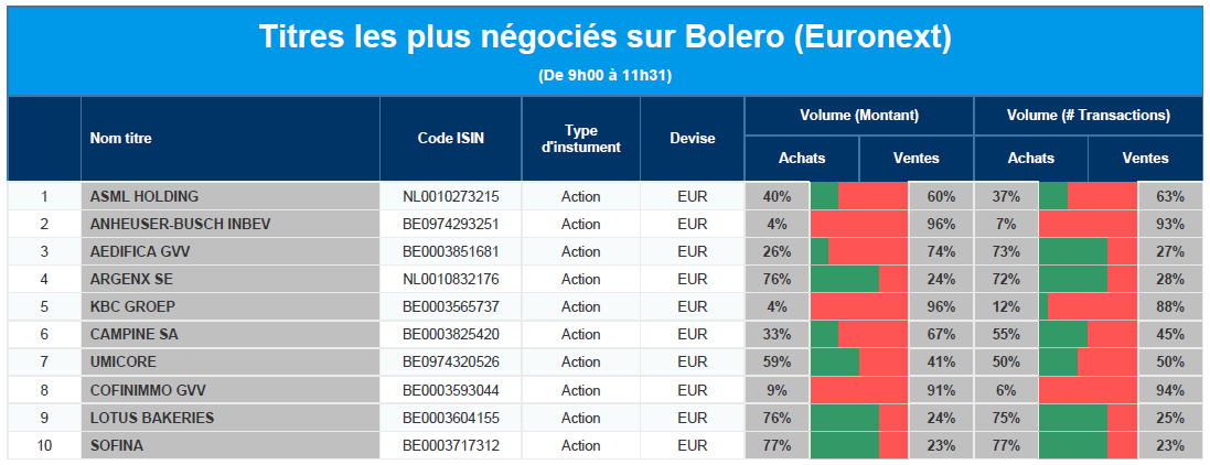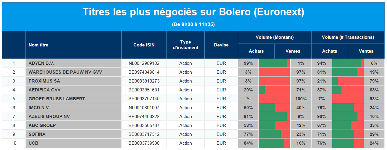 Chaque jour, nous vous offrons un aperçu des titres les plus négociés chez Bolero sur Euronext. Idéal pour prendre la température du marché boursier et pour découvrir les actions ou les titres que les autres investisseurs s'arrachent !