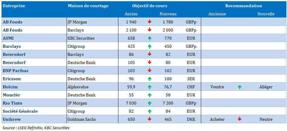 - KBC Securities revoit à la baisse l'objectif de cours de Barco après l'abandon des prévisions pour l'année entière.