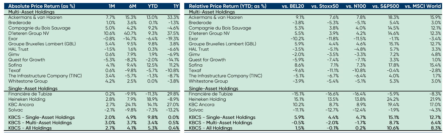 Au cours du dernier mois, l'univers des holdings suivies par KBC Securities a affiché une performance de +2,7 %, principalement due aux holdings ordinaires (+3 %), tandis que les monoholdings ont légèrement moins bien performé, en enregistrant un gain de +2 %. Les 3 holdings les plus performantes sont D'Ieteren (+10,6 %), Ackermans & van Haaren (+7,7 %) et GBL (+5,4 %), tandis que les 3 sociétés les moins performantes sont Exor (-0,8 %), Hal Trust (-1,5 %) et Quest for Growth (-5,5 %).
