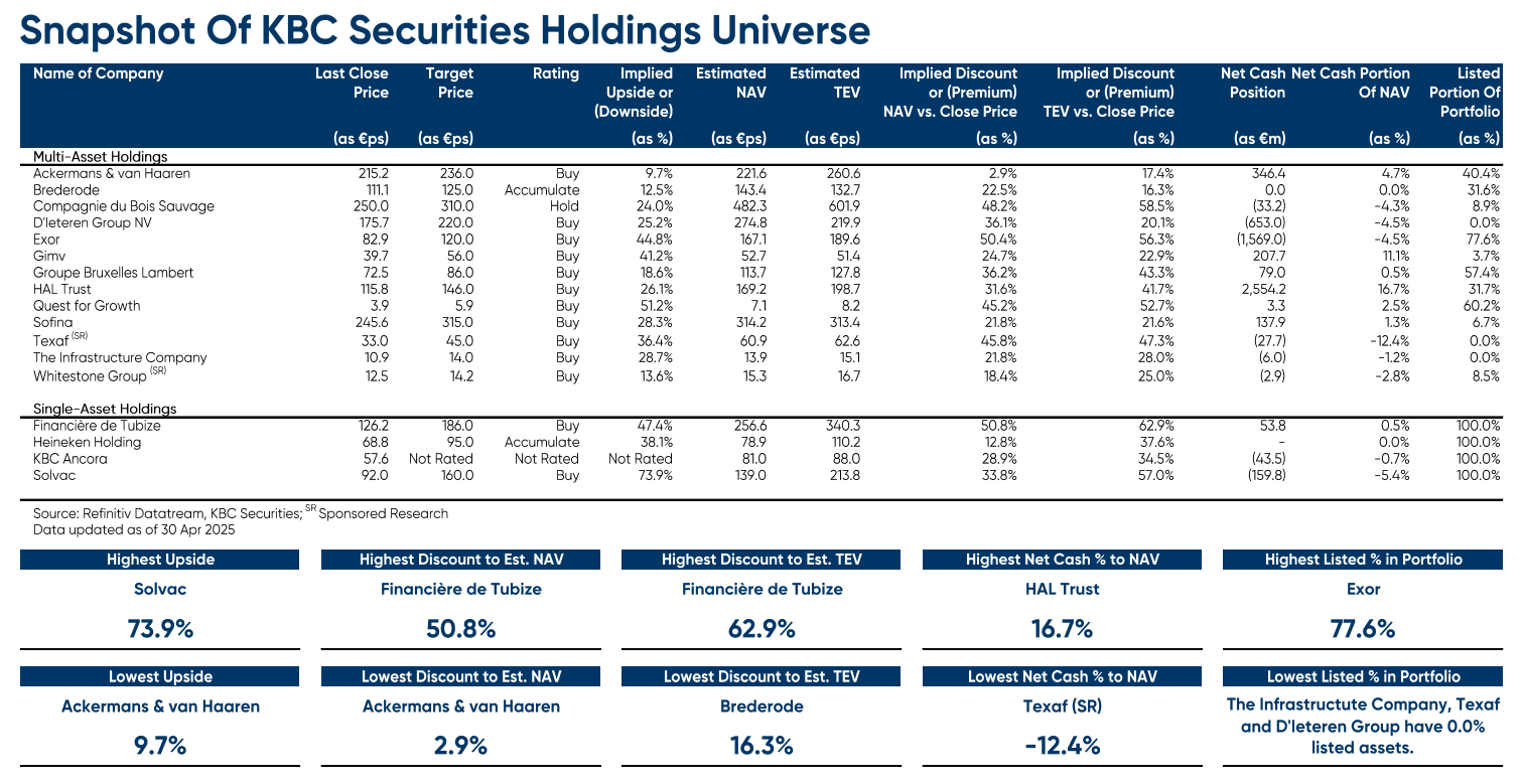 Vous trouverez ci-dessous un tableau préparé par Sharad et Livio avec leurs recommandations et objectifs de cours pour les holdings belges.