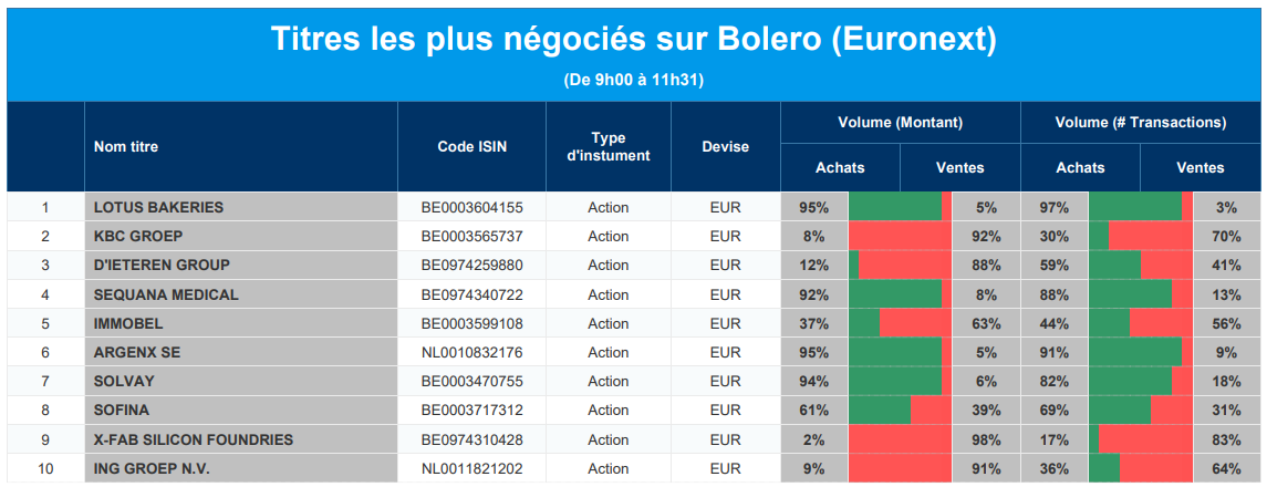 Chaque jour, nous vous offrons un aperçu des titres les plus négociés chez Bolero sur Euronext. Idéal pour prendre la température du marché boursier et pour découvrir les actions ou les titres que les autres investisseurs s'arrachent !