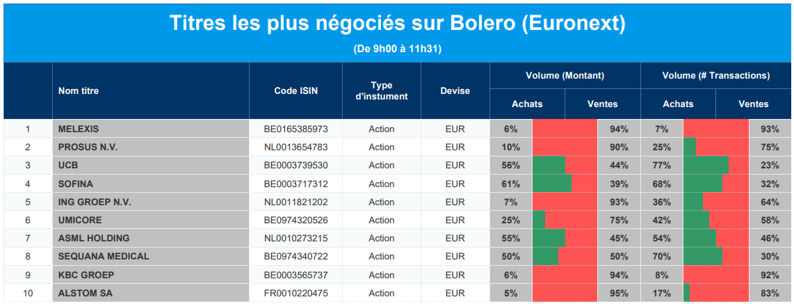 Chaque jour, nous vous offrons un aperçu des titres les plus négociés chez Bolero sur Euronext. Idéal pour prendre la température du marché boursier et pour découvrir les actions ou les titres que les autres investisseurs s'arrachent !