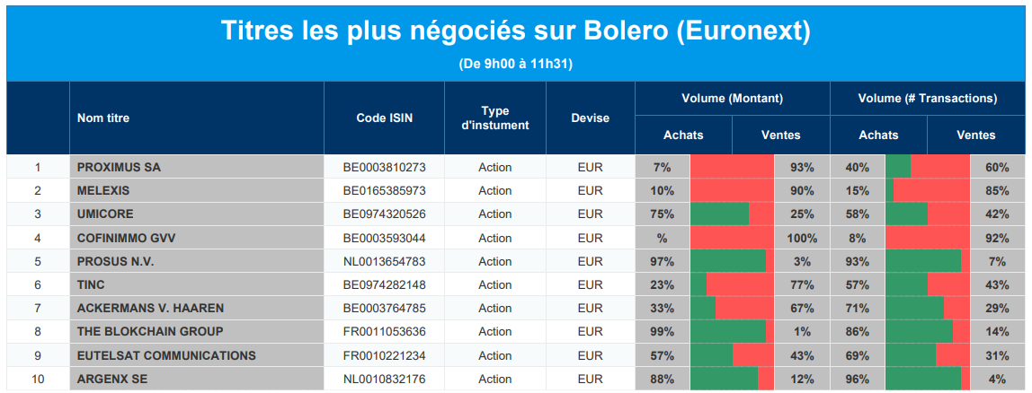 Chaque jour, nous vous offrons un aperçu des titres les plus négociés chez Bolero sur Euronext. Idéal pour prendre la température du marché boursier et pour découvrir les actions ou les titres que les autres investisseurs s'arrachent !