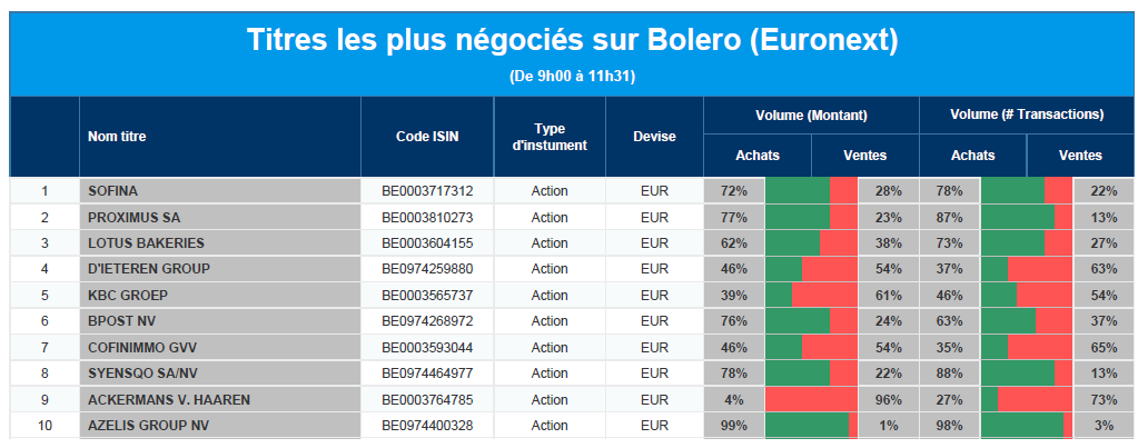 Chaque jour, nous vous offrons un aperçu des titres les plus négociés chez Bolero sur Euronext. Idéal pour prendre la température du marché boursier et pour découvrir les actions ou les titres que les autres investisseurs s'arrachent !