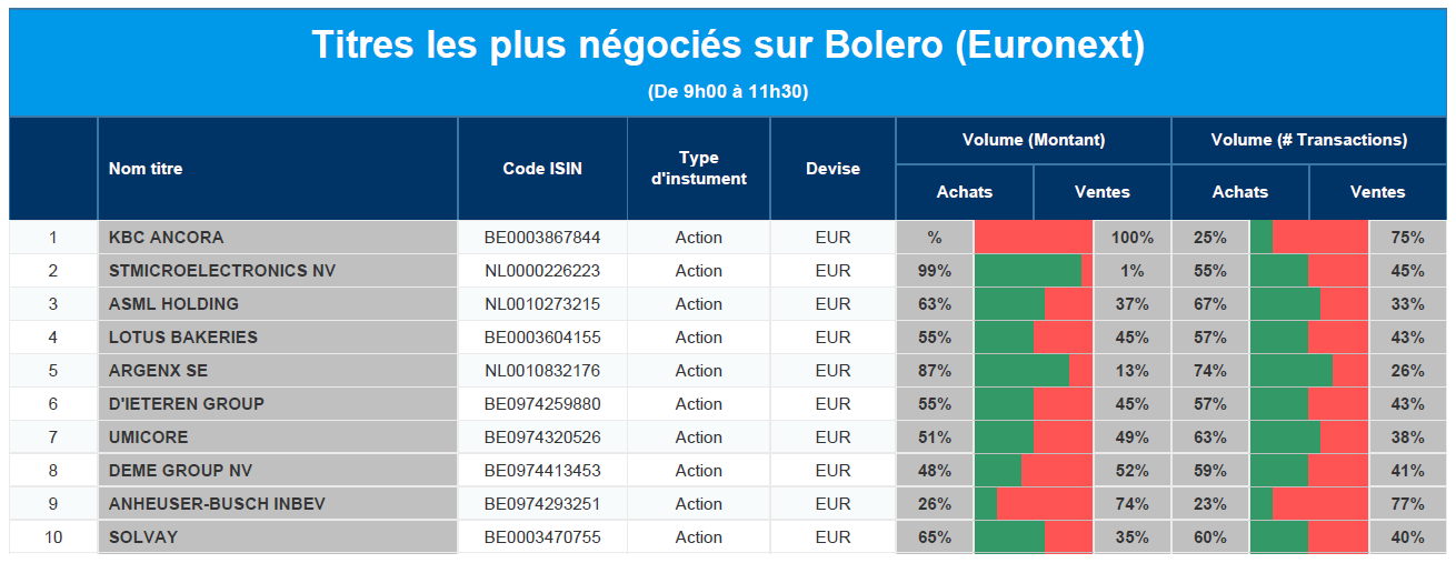 Chaque jour, nous vous offrons un aperçu des titres les plus négociés chez Bolero sur Euronext. Idéal pour prendre la température du marché boursier et pour découvrir les actions ou les titres que les autres investisseurs s'arrachent !