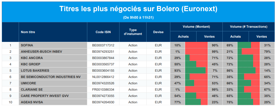 Chaque jour, nous vous offrons un aperçu des titres les plus négociés chez Bolero sur Euronext. Idéal pour prendre la température du marché boursier et pour découvrir les actions ou les titres que les autres investisseurs s'arrachent !