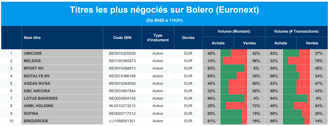 Chaque jour, nous vous offrons un aperçu des titres les plus négociés chez Bolero sur Euronext. Idéal pour prendre la température du marché boursier et pour découvrir les actions ou les titres que les autres investisseurs s'arrachent !