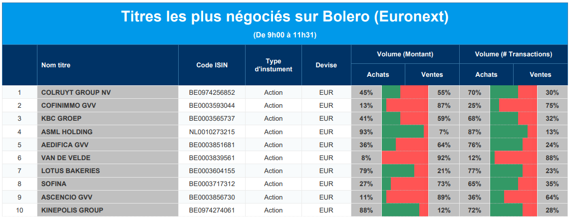 Chaque jour, nous vous offrons un aperçu des titres les plus négociés chez Bolero sur Euronext. Idéal pour prendre la température du marché boursier et pour découvrir les actions ou les titres que les autres investisseurs s'arrachent !