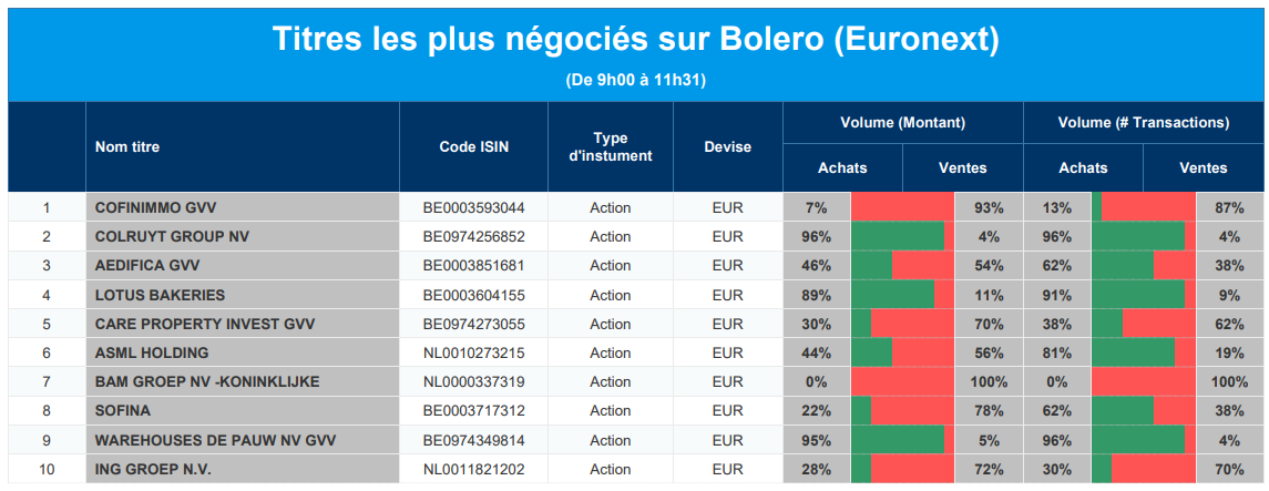Chaque jour, nous vous offrons un aperçu des titres les plus négociés chez Bolero sur Euronext. Idéal pour prendre la température du marché boursier et pour découvrir les actions ou les titres que les autres investisseurs s'arrachent !