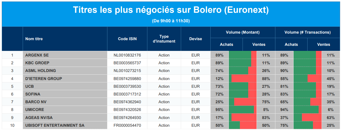 Chaque jour, nous vous offrons un aperçu des titres les plus négociés chez Bolero sur Euronext. Idéal pour prendre la température du marché boursier et pour découvrir les actions ou les titres que les autres investisseurs s'arrachent !