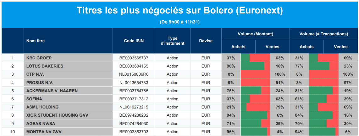 Chaque jour, nous vous offrons un aperçu des titres les plus négociés chez Bolero sur Euronext. Idéal pour prendre la température du marché boursier et pour découvrir les actions ou les titres que les autres investisseurs s'arrachent !