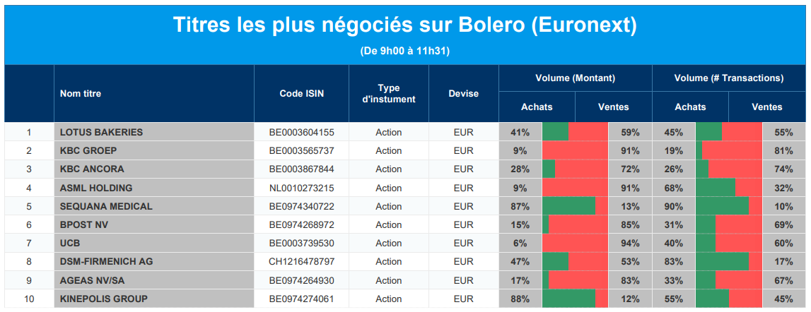 Chaque jour, nous vous offrons un aperçu des titres les plus négociés chez Bolero sur Euronext. Idéal pour prendre la température du marché boursier et pour découvrir les actions ou les titres que les autres investisseurs s'arrachent !