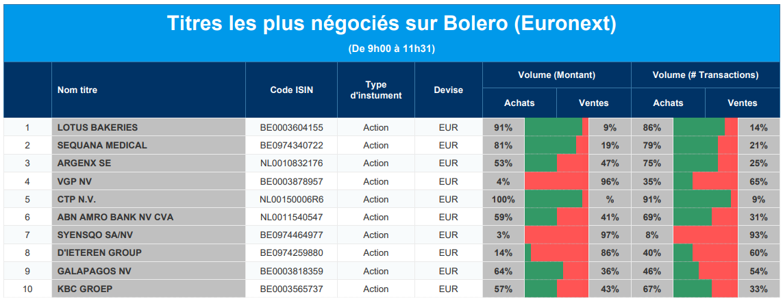 Chaque jour, nous vous offrons un aperçu des titres les plus négociés chez Bolero sur Euronext. Idéal pour prendre la température du marché boursier et pour découvrir les actions ou les titres que les autres investisseurs s'arrachent !