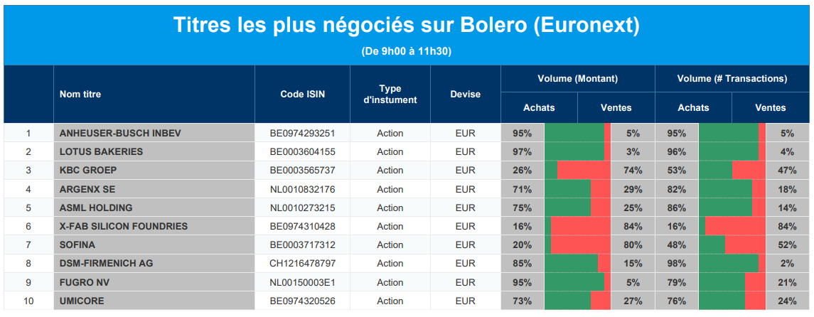 haque jour, nous vous offrons un aperçu des titres les plus négociés chez Bolero sur Euronext. Idéal pour prendre la température du marché boursier et pour découvrir les actions ou les titres que les autres investisseurs s'arrachent !