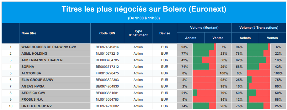 Chaque jour, nous vous offrons un aperçu des titres les plus négociés chez Bolero sur Euronext. Idéal pour prendre la température du marché boursier et pour découvrir les actions ou les titres que les autres investisseurs s'arrachent !