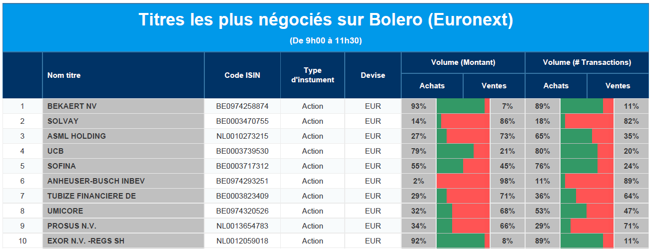 Chaque jour, nous vous offrons un aperçu des titres les plus négociés chez Bolero sur Euronext. Idéal pour prendre la température du marché boursier et pour découvrir les actions ou les titres que les autres investisseurs s'arrachent !