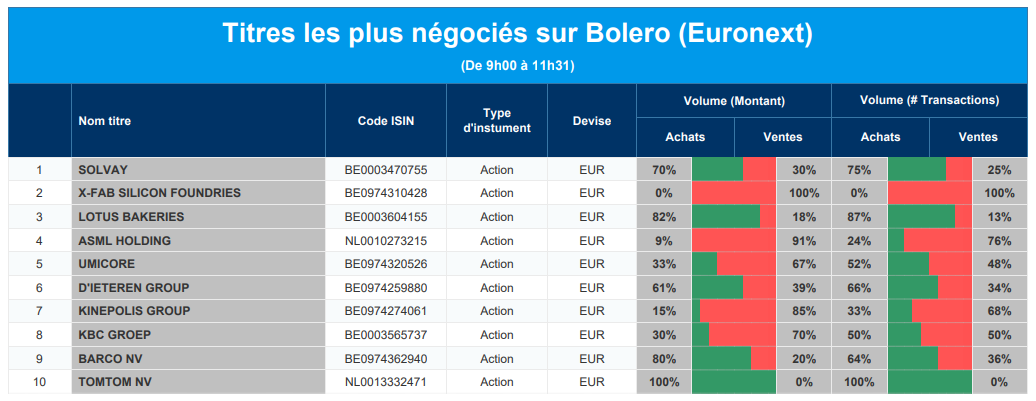 Chaque jour, nous vous offrons un aperçu des titres les plus négociés chez Bolero sur Euronext. Idéal pour prendre la température du marché boursier et pour découvrir les actions ou les titres que les autres investisseurs s'arrachent !
