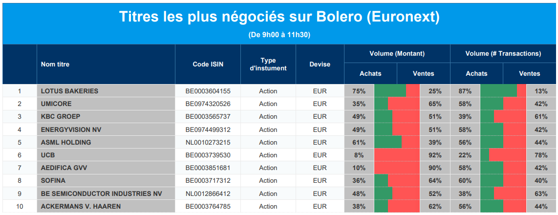 Chaque jour, nous vous offrons un aperçu des titres les plus négociés chez Bolero sur Euronext. Idéal pour prendre la température du marché boursier et pour découvrir les actions ou les titres que les autres investisseurs s'arrachent !