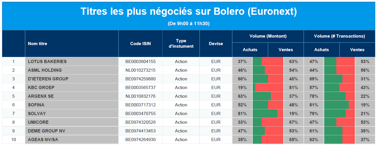 Chaque jour, nous vous offrons un aperçu des titres les plus négociés chez Bolero sur Euronext. Idéal pour prendre la température du marché boursier et pour découvrir les actions ou les titres que les autres investisseurs s'arrachent !