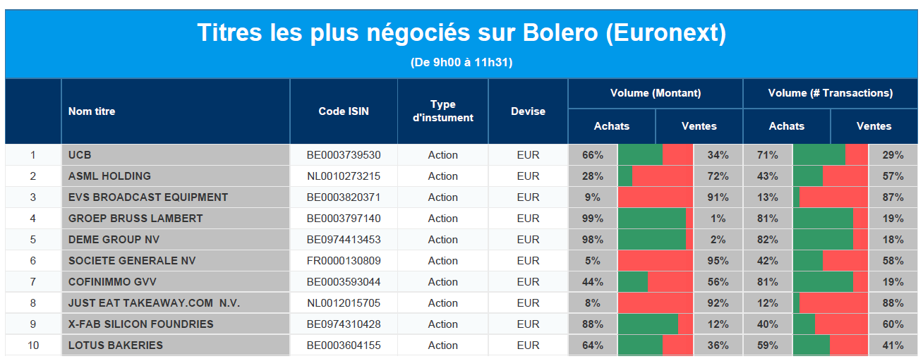 Chaque jour, nous vous offrons un aperçu des titres les plus négociés chez Bolero sur Euronext. Idéal pour prendre la température du marché boursier et pour découvrir les actions ou les titres que les autres investisseurs s'arrachent !