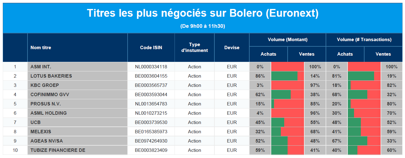 Chaque jour, nous vous offrons un aperçu des titres les plus négociés chez Bolero sur Euronext. Idéal pour prendre la température du marché boursier et pour découvrir les actions ou les titres que les autres investisseurs s'arrachent !