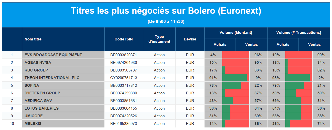 Chaque jour, nous vous offrons un aperçu des titres les plus négociés chez Bolero sur Euronext. Idéal pour prendre la température du marché boursier et pour découvrir les actions ou les titres que les autres investisseurs s'arrachent !