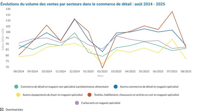 Sur un an, le volume des ventes réalisées dans le commerce de détail, à l’exception des carburants, a connu une baisse de 0,4 %, avec des disparités importantes par secteur comme le montre le graphique.