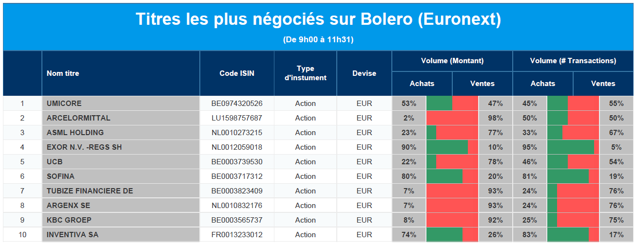 Chaque jour, nous vous offrons un aperçu des titres les plus négociés chez Bolero sur Euronext. Idéal pour prendre la température du marché boursier et pour découvrir les actions ou les titres que les autres investisseurs s'arrachent !