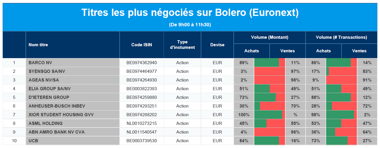 Chaque jour, nous vous offrons un aperçu des titres les plus négociés chez Bolero sur Euronext. Idéal pour prendre la température du marché boursier et pour découvrir les actions ou les titres que les autres investisseurs s'arrachent !