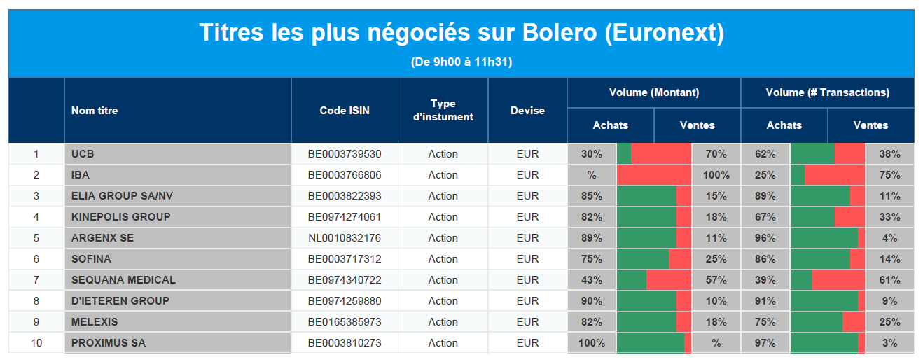 Chaque jour, nous vous offrons un aperçu des titres les plus négociés chez Bolero sur Euronext. Idéal pour prendre la température du marché boursier et pour découvrir les actions ou les titres que les autres investisseurs s'arrachent !