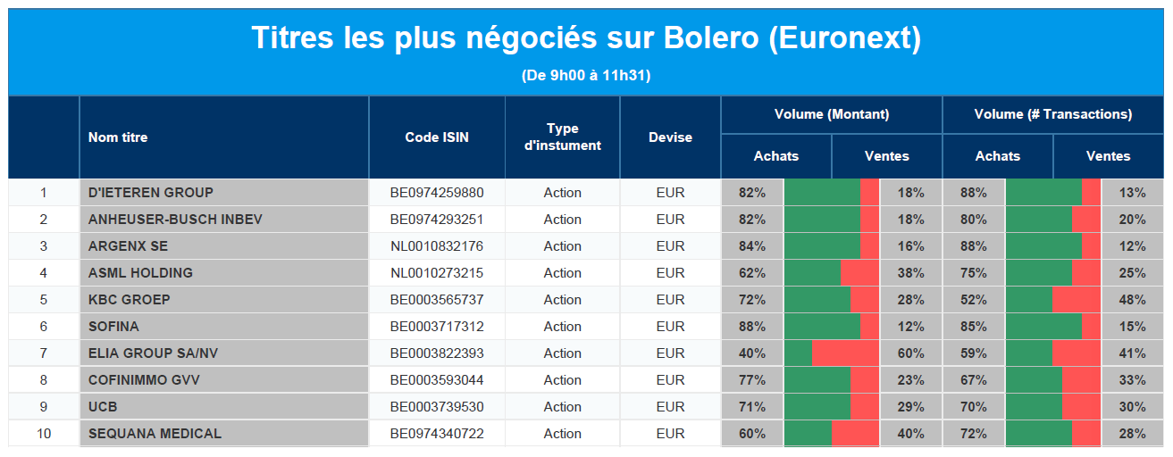 Chaque jour, nous vous offrons un aperçu des titres les plus négociés chez Bolero sur Euronext. Idéal pour prendre la température du marché boursier et pour découvrir les actions ou les titres que les autres investisseurs s'arrachent !