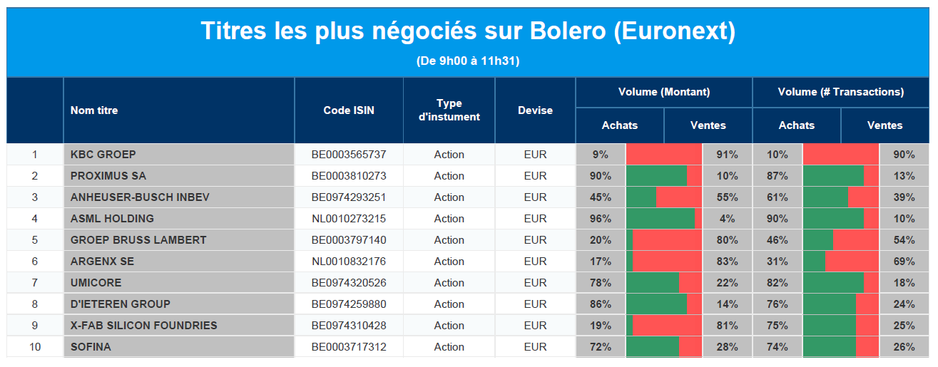 Chaque jour, nous vous offrons un aperçu des titres les plus négociés chez Bolero sur Euronext. Idéal pour prendre la température du marché boursier et pour découvrir les actions ou les titres que les autres investisseurs s'arrachent !