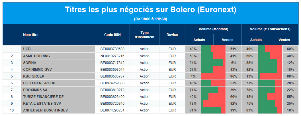 Chaque jour, nous vous offrons un aperçu des titres les plus négociés chez Bolero sur Euronext. Idéal pour prendre la température du marché boursier et pour découvrir les actions ou les titres que les autres investisseurs s'arrachent !