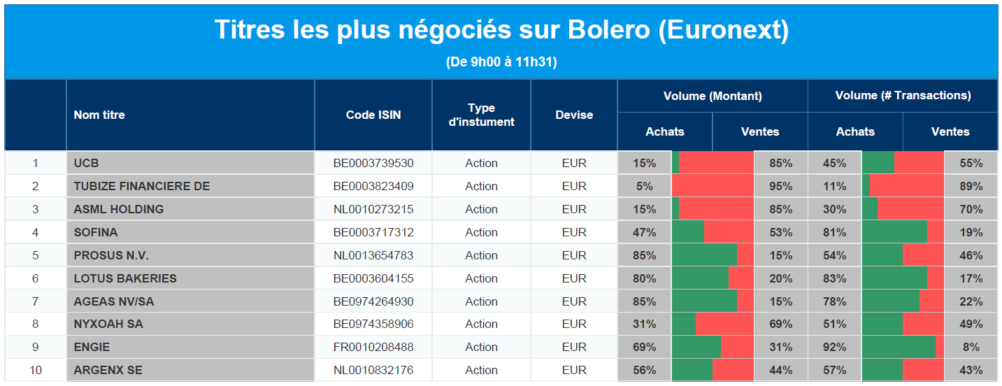 Chaque jour, nous vous offrons un aperçu des titres les plus négociés chez Bolero sur Euronext. Idéal pour prendre la température du marché boursier et pour découvrir les actions ou les titres que les autres investisseurs s'arrachent !