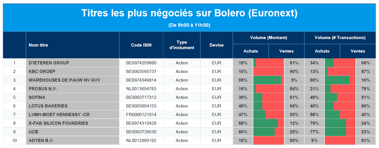 Chaque jour, nous vous offrons un aperçu des titres les plus négociés chez Bolero sur Euronext. Idéal pour prendre la température du marché boursier et pour découvrir les actions ou les titres que les autres investisseurs s'arrachent !
