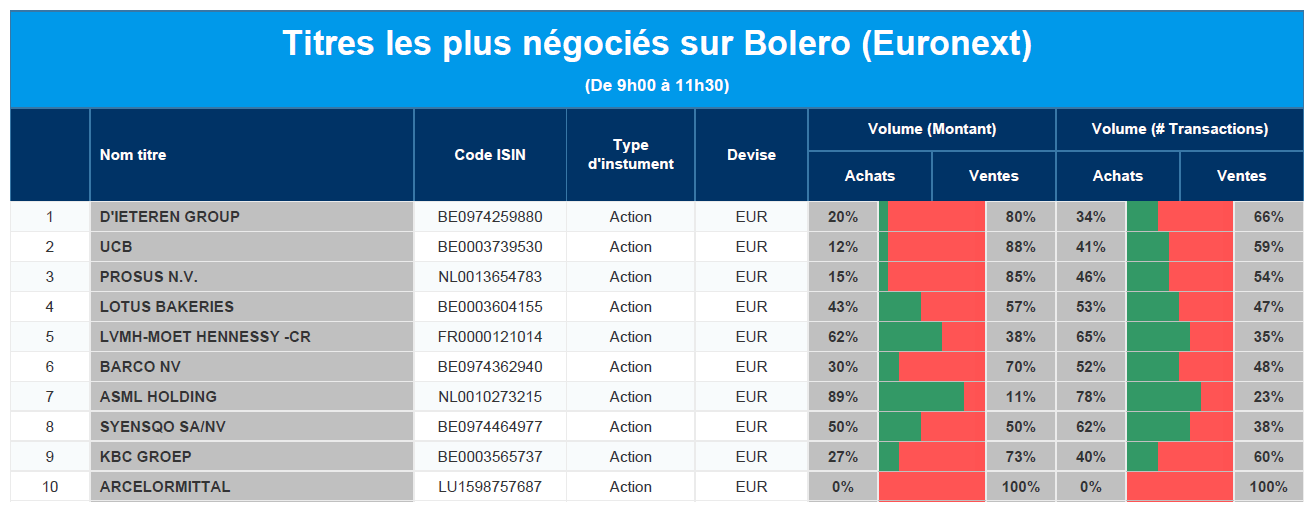 Chaque jour, nous vous offrons un aperçu des titres les plus négociés chez Bolero sur Euronext. Idéal pour prendre la température du marché boursier et pour découvrir les actions ou les titres que les autres investisseurs s'arrachent !