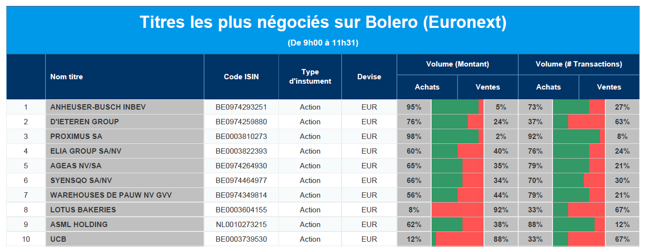 Chaque jour, nous vous offrons un aperçu des titres les plus négociés chez Bolero sur Euronext. Idéal pour prendre la température du marché boursier et pour découvrir les actions ou les titres que les autres investisseurs s'arrachent !